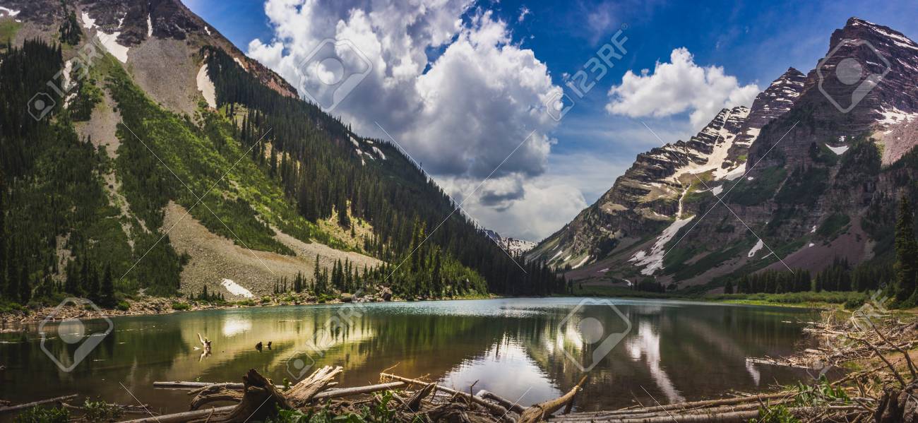 Panorama Of Pyramid Peak Left Maroon Bells Right And Crater Lake In Snowmass Wilderness In Aspen Colorado With A Blue Sky And Clouds In Summer Stock Photo Picture And Royalty Free Image